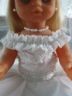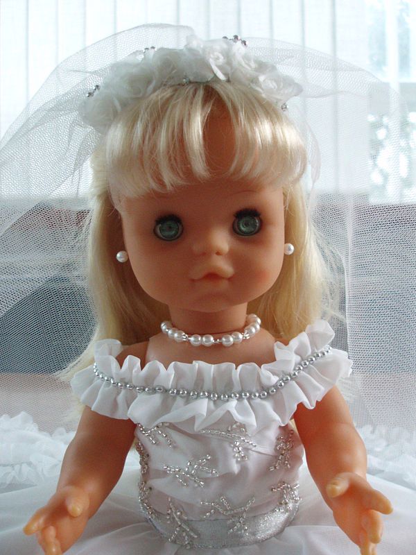 Pro Marcelu na svatbu 07/2011Maminka Marcely je moje kolegyně z práce a poprosila mě, jestli bych neušila dceři na svatbu šaty na panenku. Jelikož mojí tvorbu zná a byla už i na pár výstavách, nemohla jsem samozřejmě odmítnout. Panenka byla tentokrát taková ta klasická, hrací panenka, takové to děťátko, baculatá, vystrčené bříško, trošku hůř se na ně šije, protože to není žádná modelka a tak jsem se bála, aby se to vůbec líbilo, ale dopadlo to nakonec dobře. Živůtek jsem napodobila podle skutečných svatebních šatů, spadnutá, nabraná ramínka a povyšívané tělíčko, spodek jsem musela udělat klasický, kolovou sukni s kanýrky, když se chce panenka posadit na auto, tak to ani jinak nejde. Vše je laděno do bílostříbrna, panenka má i perlový náhrdelník a náušnice a samozřejmě závoj, tentokrát ozdobený bílými růžemi.