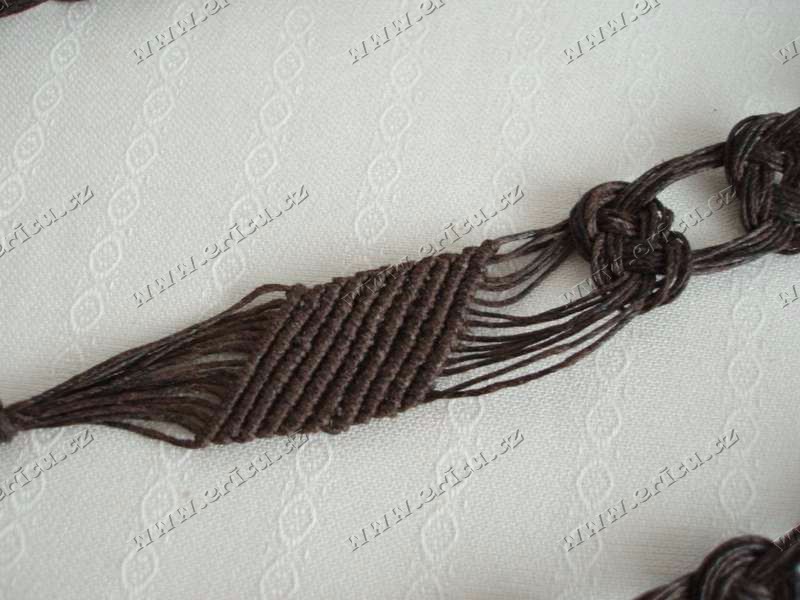 V roce 2007 jsem byla s drháním v Klubu seniorů v Čakovicích, kam pravidelně jezdím s předváděním různých technik a pro tuto příležitost jsem udrhala spoustu věcí, protože doma jsem už nic neměla. Jako první vám představuji 2 závěsy na stěnu, žluto hnědý je závěs s pravidelným vzorem, na kterém jsem předvedla všechny hlavní uzly, které se pužívají při drhání. Druhý, cihlově hnědý a tmavě hnědý je taková fantazie, je to jen příklad, jak se dají kombinovat provázky a např. nezvyklá pletací příze ve formě melírované stuhy.