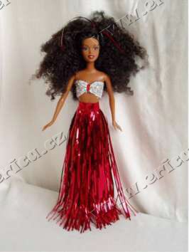 nitkami lurexu, dozdobený flitry. Sukně je ušitá z červených vánočních