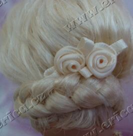 použila jemně vzorovaný brokát, krajky, prýmky, stuhy a zlaté korálky.
