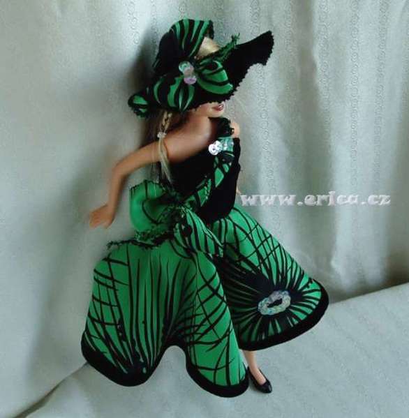 Datum výroby už nevím, odhaduji na rok 1997-8, jedny z mála, které mají i klobouk. Kolová sukně lemovaná černou sametkou, sametový živůtek a troška flitrů a model byl na světě. Opět nic složitého, co byste tak čekali na začátku mé tvorby.