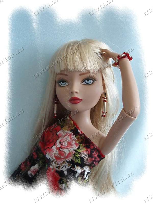 Náhrdelník se k těmto šatům nehodil, takže panenka má jen náušnice a