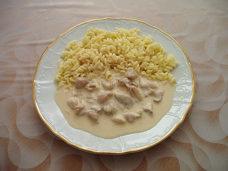 olej, cibule, sladká smetana 2-3 dcl, hořčice, sůl, těstoviny.