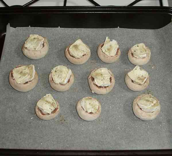 Co potřebujete: 250g čerstvých žampiónů (11-12 hlaviček), 1 hermelín s bylinkami,