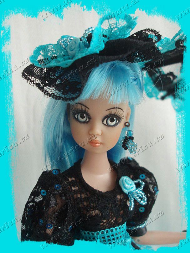 paraplíčko a klobouček je z černé a tyrkysové krajky. Paraplíčko bylo