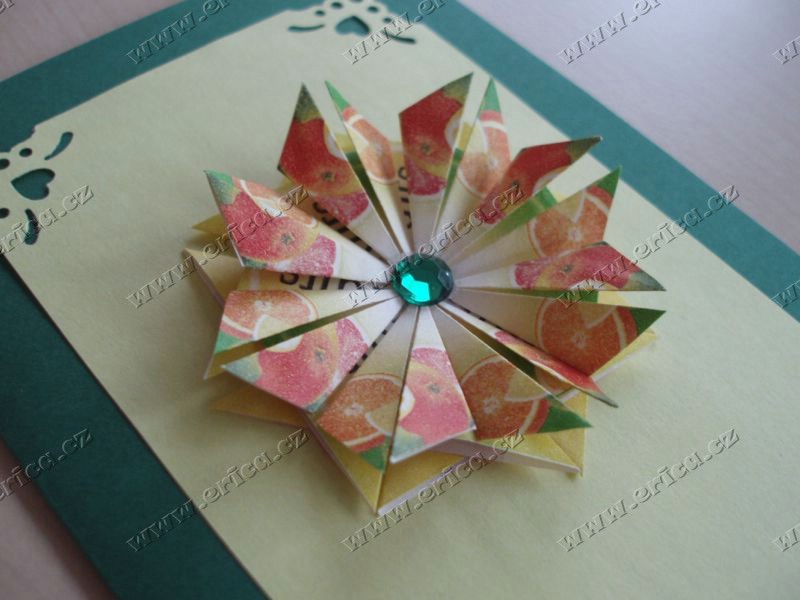Zelená hvězdička 8 dílná - postupTakže kudy do toho. Na následujících obrázcích můžete vidět jeden z postupů skládání hvězdiček, jinak je jich spousta, připojím i odkaz, kde najdete spoustu dalších stránek s různými druhy skládání. Nejdřív si nasbírejte sáčky od čajů, na hvězdičku, kterou jsem tady použila je zapotřebí 8 kousků, ale raději 10, protože na 2 si vyzkoušíte jak to nejlépe naskládat, abyste se vyhly písmu a logům. Nejdříve ustřihneme bílé okraje sáčku a většinou i spodní část sáčku, sáček začíná obrázkem na spodní straně. Složte přes úhlopříčku nalevo i napravo, ustřihněte přebývající část a pak složte klasicky na polovinu, jak horizontálně, tak vertikálně. Teď si musíte najít, jak bude nejlepší vzorek naskládat, máte několik možností, většinou to dělám tak, že písmo na sáčku se snažím skrýt a tudíž tuto část protlačím směrem dovnitř. To udělám i z druhé strany a vznikne složený trojúhelník. Určím si, která strana bude přední (taková, která má hezký obrázek bez písma), zadní části ohnu směrem nahoru a přední směrem dolů a dovnitř. Špatně se to vysvětluje a nakreslit to neumím, takže buď to pochopíte z fotek, anebo to někde vypátráte v mých odkazech. V každém případě je to zábava, zkuste to se mnou :-)).Oranžová hvězdička 4 dílná - postupJe o trochu jednodušší a postup je stejný až po utvoření trojúhelníku. Potom ohnete přední cíp trojúhelníku a otočíte nahoru zleva i zprava a skládání je hotové a je to čtvrtina hvězdičky.Pro vstup do jednotlivých galerií klikněte na obrázek