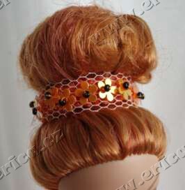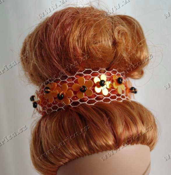 oranžových lístků, pošitých flitry a korálky. Konce lístků i část živůtku